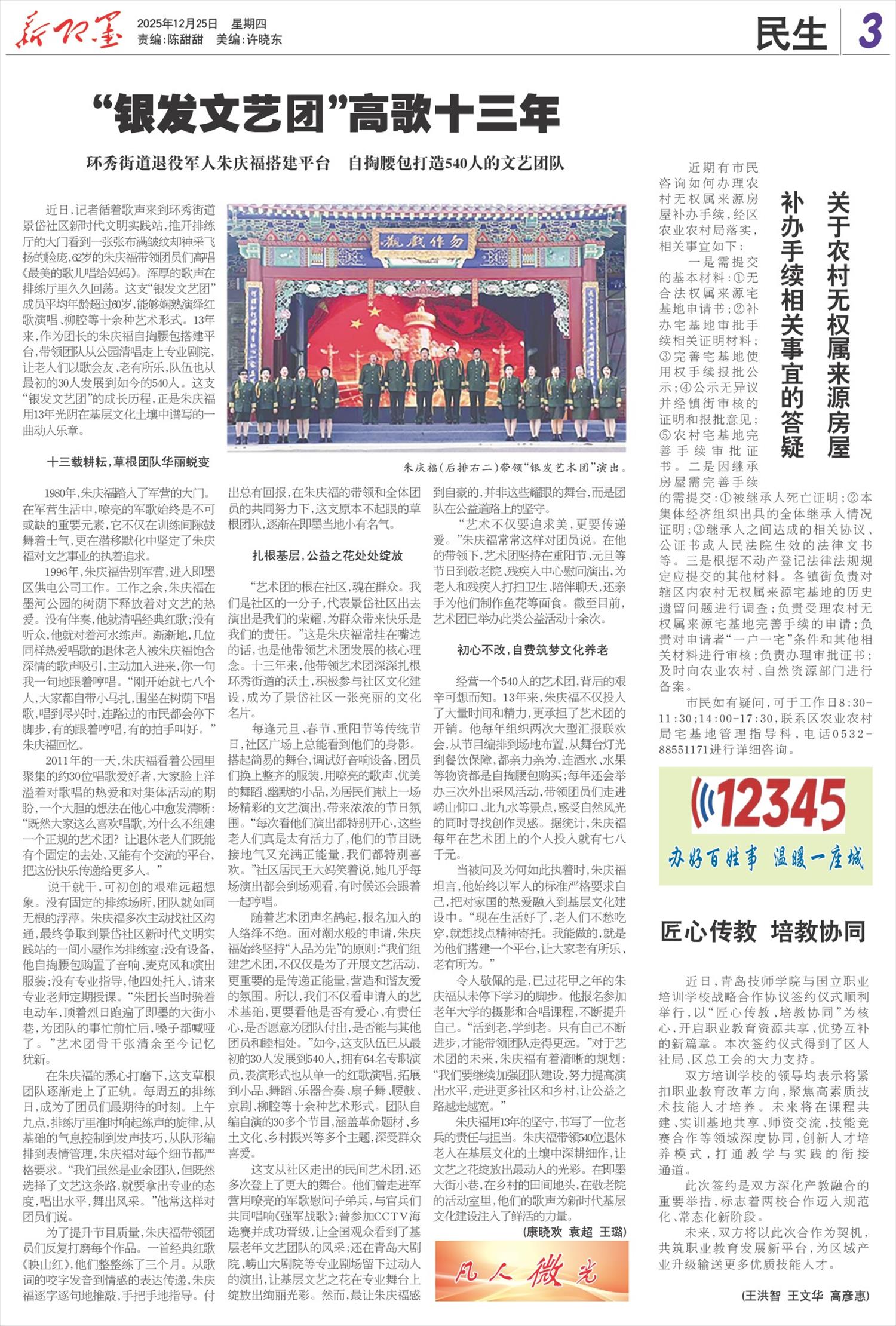 这支从社区走出的民间艺术团,还多次登上了更大的舞台。他们曾走进军营用嘹亮的军歌慰问子弟兵,与官兵们共同唱响《强军战歌》;曾参加CCTV海选赛并成功晋级,让全国观众看到了基层老年文艺团队的风采;还在青岛大剧院、崂山大剧院等专业剧场留下过动人的演出,让基层文艺之花在专业舞台上绽放出绚丽光彩。然而,最让朱庆福感到自豪的,并非这些耀眼的舞台,而是团队在公益道路上的坚守。