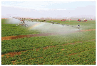智能喷灌机在麦田里灌溉作业。