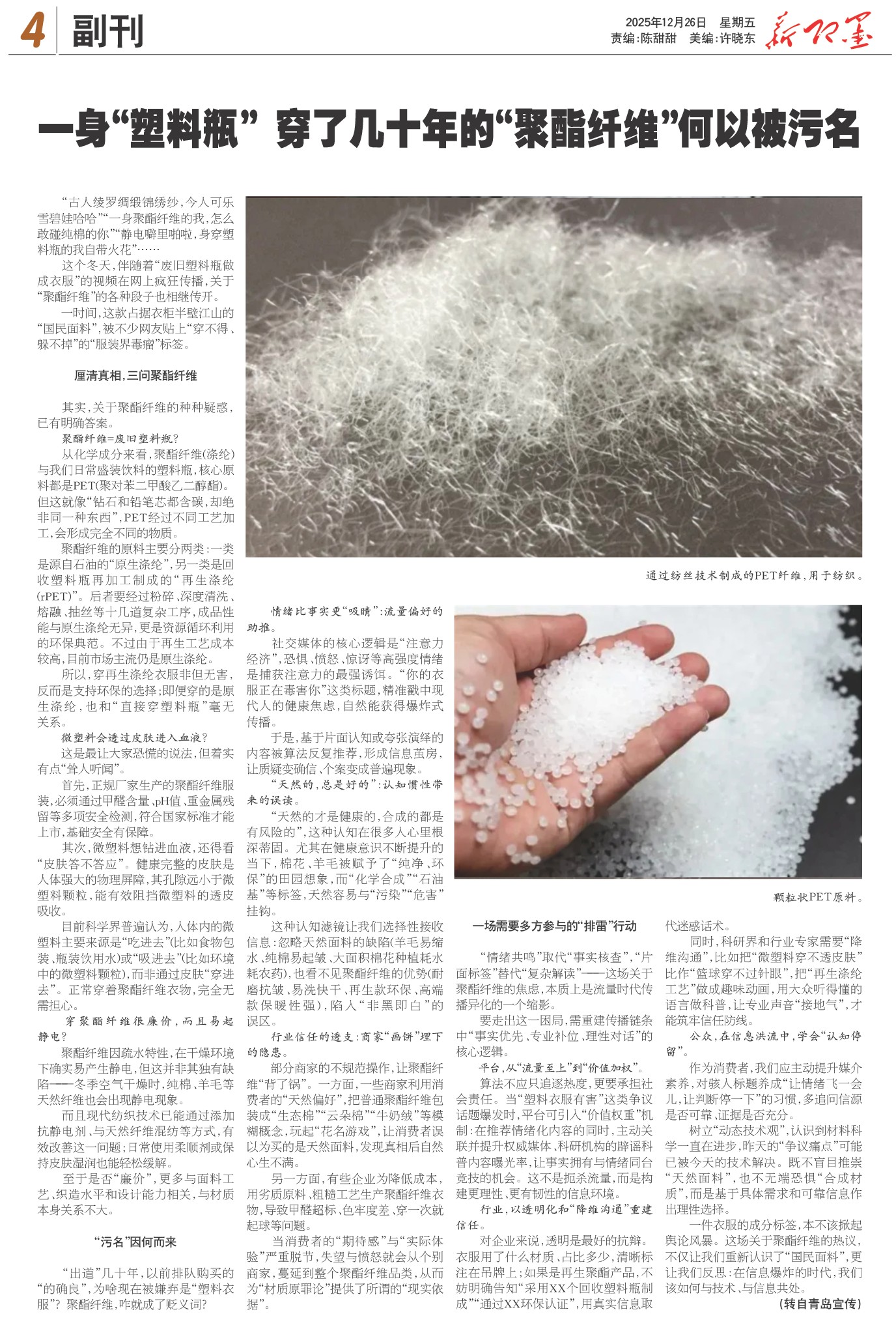 “情绪共鸣”取代“事实核查”,“片面标签”替代“复杂解读”——这场关于聚酯纤维的焦虑,本质上是流量时代传播异化的一个缩影。