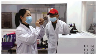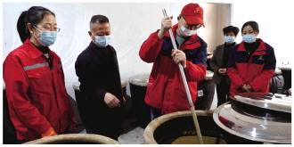张海聚(左二)在车间检查发酵情况。