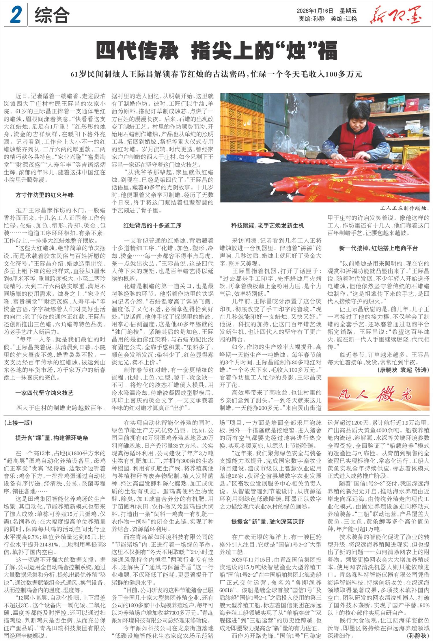 “每年一入冬,就是我们最忙的时候。”王际昌笑着说,从清晨到日暮,小院里的炉火昼夜不熄,蜡香袅袅不散。一支支历经百年传承的红蜡烛,被运到山东各地的年货市场,为千家万户的新春添上一抹喜庆的亮色。