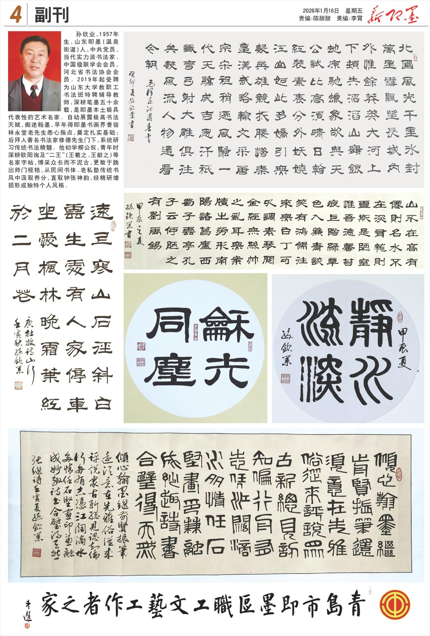 孙钦业,1957年生,山东即墨(温泉街道)人,中共党员,当代实力派书法家、中国楹联学会会员,河北省书法协会会员。2019年起受聘为山东大学教职工书法班特聘辅导教师,深耕笔墨五十余载,是即墨本土极具代表性的艺术名家。自幼展露极高书法天赋,痴迷翰墨,早年得即墨书画界耆宿林永堂老先生悉心指点,奠定扎实基础;后拜入著名书法家修德先生门下,系统研习传统书法精髓。他初学柳公权,青年时深耕欧阳询及“二王”(王羲之、王献之)等名家字帖,博采众长而不泥古,更敢于跳出师门桎梏,从民间书体、老私塾传统书风中汲取养分,直取钟张神韵,经精研增损形成独特个人风格。