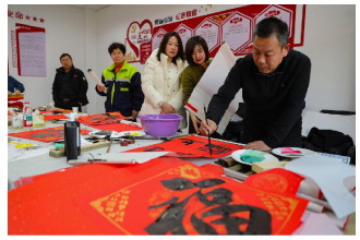 日前,区新联会在潮海街道胜利社区康庭嘉苑小区开展“新联同心暖社区,新春送福到胜利”活动,来自新联会的书画家们现场挥毫泼墨,写福字、送春联,传递传统年味的同时,增强了社区的艺术文化氛围。 (钟坤绩)