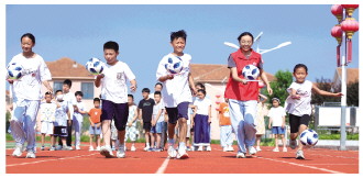 前东葛公益课堂,大学生志愿者与学生玩“托球跑”游戏。