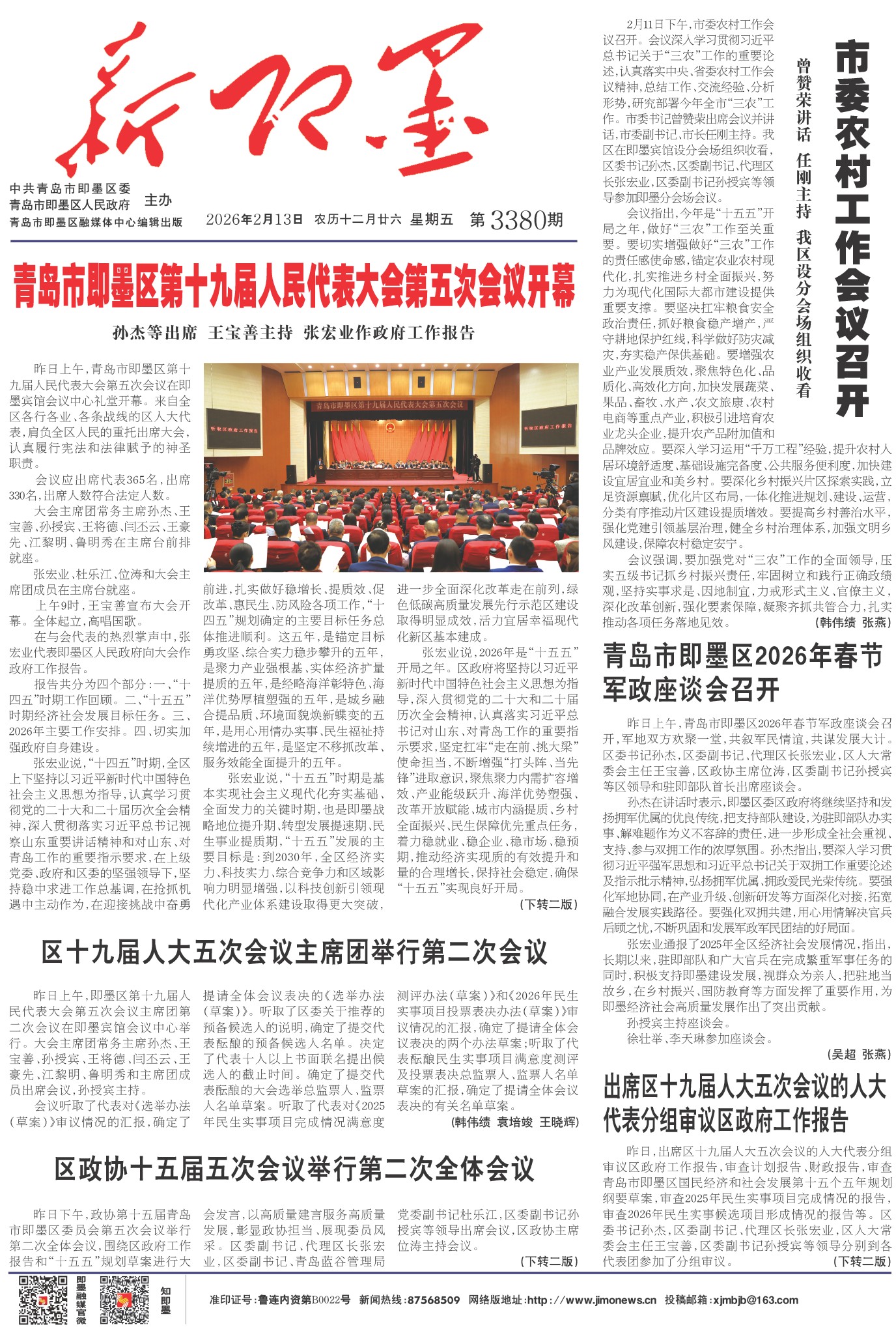 张宏业说,2026年是“十五五”开局之年。区政府将坚持以习近平新时代中国特色社会主义思想为指导,深入贯彻党的二十大和二十届历次全会精神,认真落实习近平总书记对山东、对青岛工作的重要指示要求,坚定扛牢“走在前、挑大梁”使命担当,不断增强“打头阵、当先锋”进取意识,聚焦聚力内需扩容增效、产业能级跃升、海洋优势塑强、改革开放赋能、城市内涵提质、乡村全面振兴、民生保障优先重点任务,着力稳就业、稳企业、稳市场、稳预期,推动经济实现质的有效提升和量的合理增长,保持社会稳定,确保“十五五”实现良好开局。