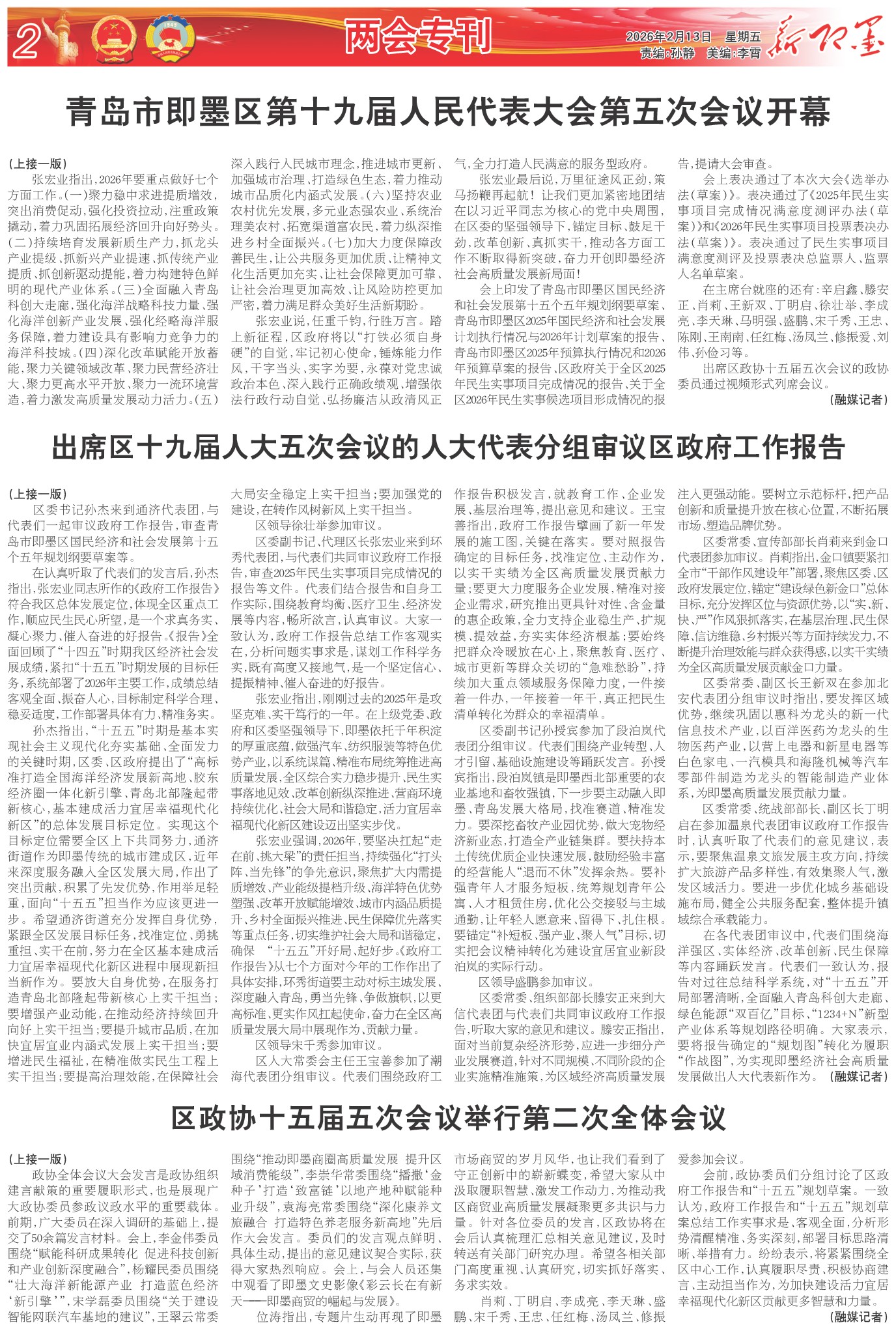 会上印发了青岛市即墨区国民经济和社会发展第十五个五年规划纲要草案、青岛市即墨区2025年国民经济和社会发展计划执行情况与2026年计划草案的报告、青岛市即墨区2025年预算执行情况和2026年预算草案的报告、区政府关于全区2025年民生实事项目完成情况的报告、关于全区2026年民生实事候选项目形成情况的报告,提请大会审查。