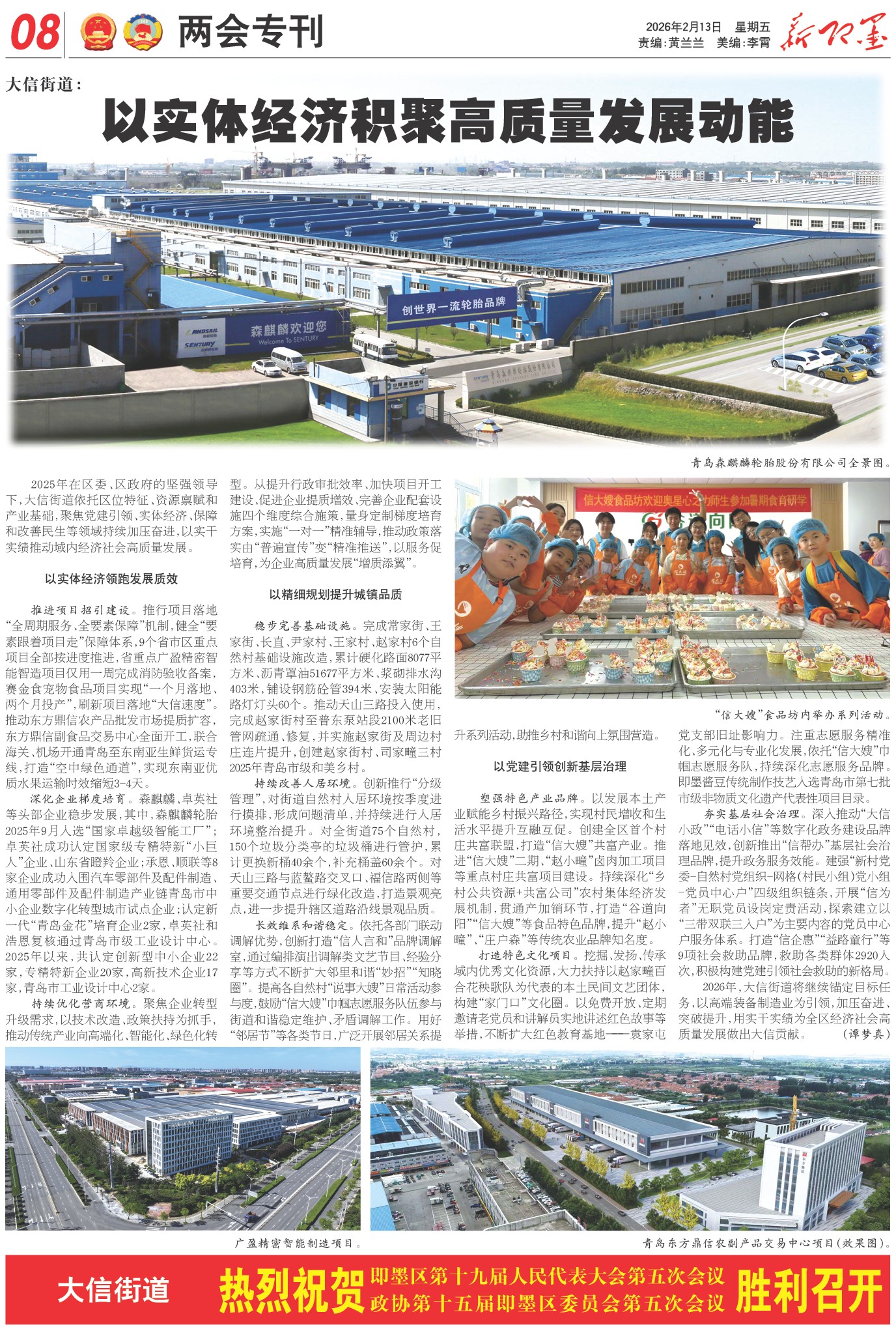2026年,大信街道将继续锚定目标任务,以高端装备制造业为引领,加压奋进、突破提升,用实干实绩为全区经济社会高质量发展做出大信贡献。 (谭梦真)