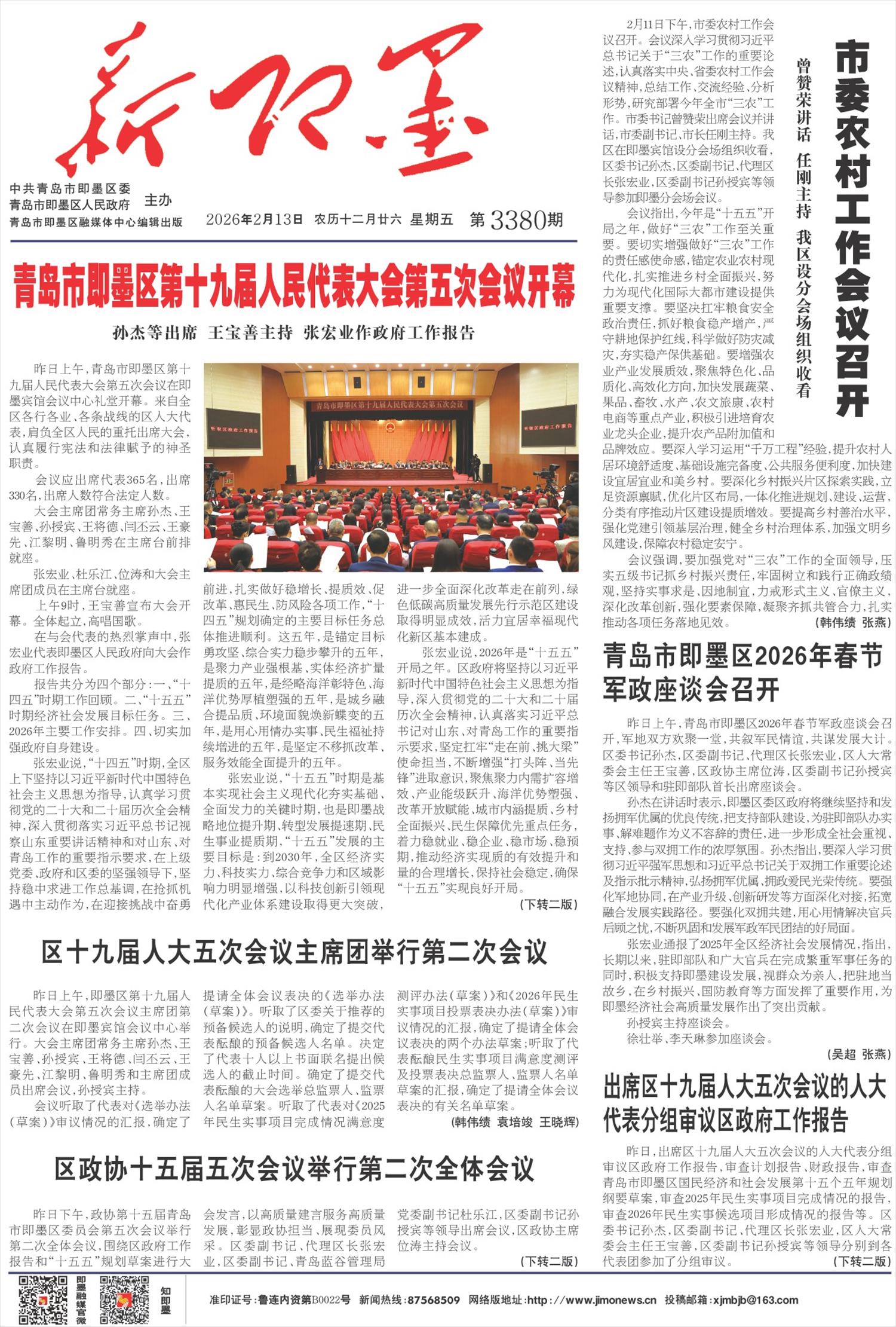 张宏业指出,刚刚过去的2025年是攻坚克难、实干笃行的一年。在上级党委、政府和区委坚强领导下,即墨依托千年积淀的厚重底蕴,做强汽车、纺织服装等特色优势产业,以系统谋篇、精准布局统筹推进高质量发展,全区综合实力稳步提升、民生实事落地见效、改革创新纵深推进、营商环境持续优化、社会大局和谐稳定,活力宜居幸福现代化新区建设迈出坚实步伐。
