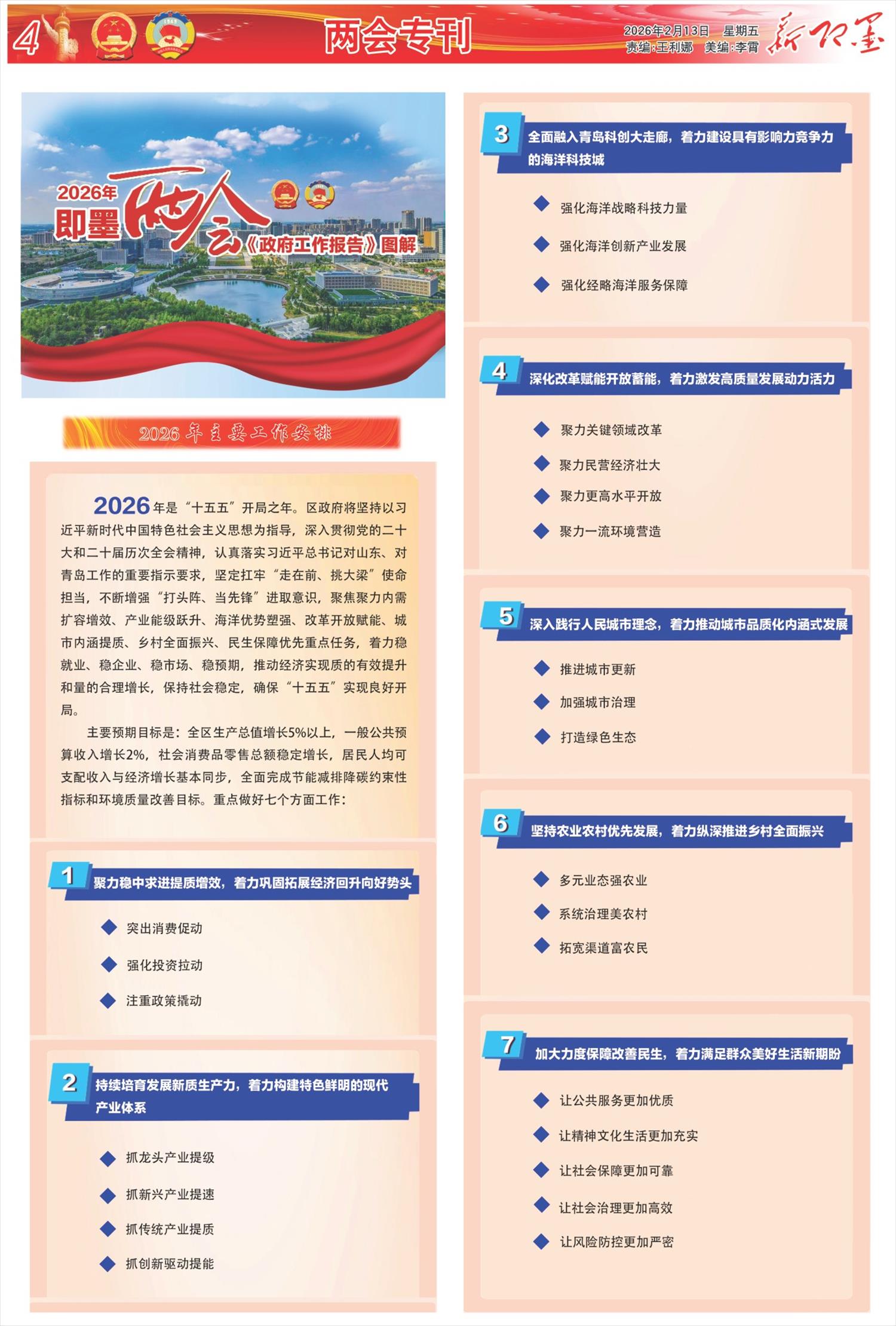 张宏业说,2026年是“十五五”开局之年。区政府将坚持以习近平新时代中国特色社会主义思想为指导,深入贯彻党的二十大和二十届历次全会精神,认真落实习近平总书记对山东、对青岛工作的重要指示要求,坚定扛牢“走在前、挑大梁”使命担当,不断增强“打头阵、当先锋”进取意识,聚焦聚力内需扩容增效、产业能级跃升、海洋优势塑强、改革开放赋能、城市内涵提质、乡村全面振兴、民生保障优先重点任务,着力稳就业、稳企业、稳市场、稳预期,推动经济实现质的有效提升和量的合理增长,保持社会稳定,确保“十五五”实现良好开局。