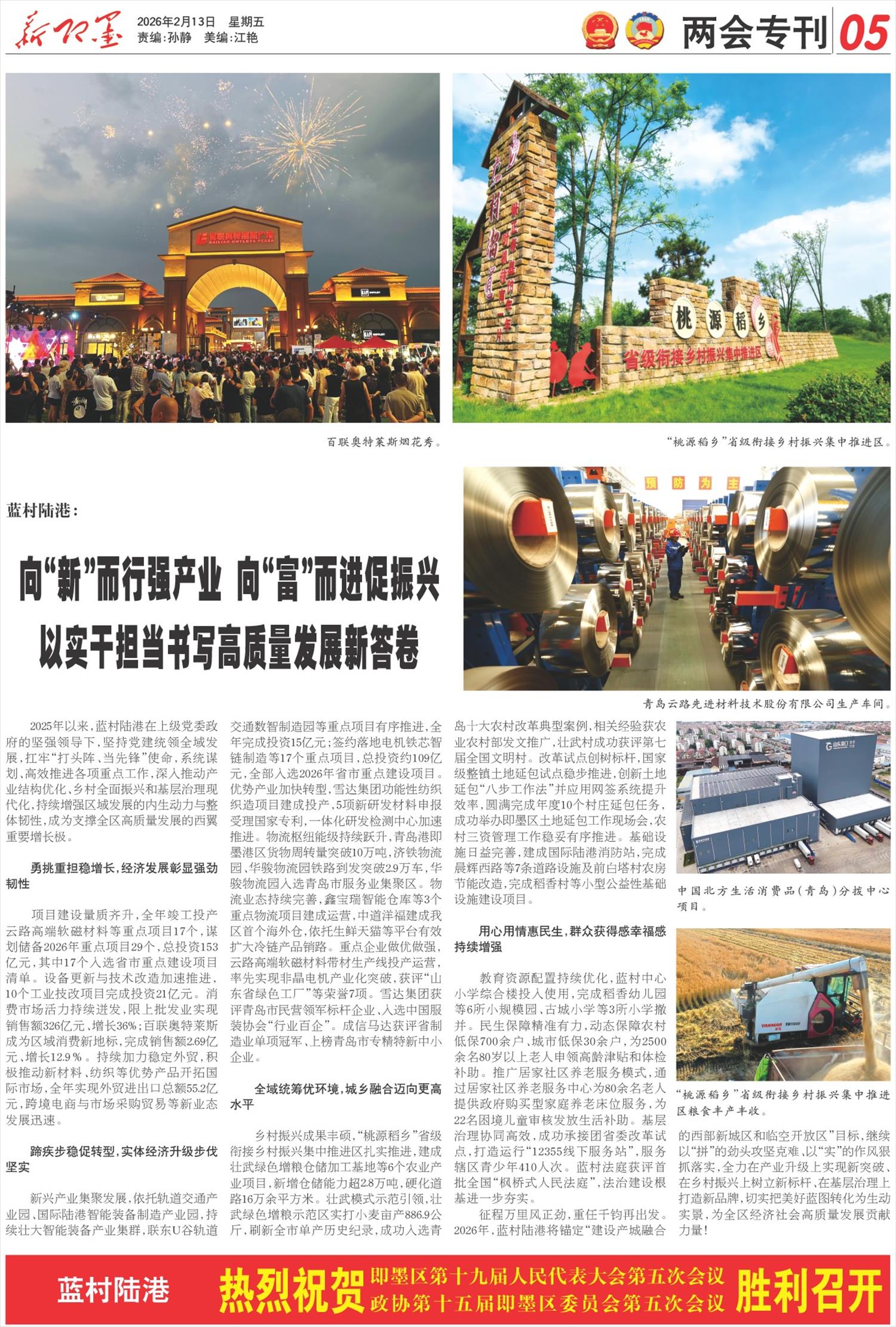 新兴产业集聚发展,依托轨道交通产业园、国际陆港智能装备制造产业园,持续壮大智能装备产业集群,联东U谷轨道交通数智制造园等重点项目有序推进,全年完成投资15亿元;签约落地电机铁芯智链制造等17个重点项目,总投资约109亿元,全部入选2026年省市重点建设项目。优势产业加快转型,雪达集团功能性纺织织造项目建成投产,5项新研发材料申报受理国家专利,一体化研发检测中心加速推进。物流枢纽能级持续跃升,青岛港即墨港区货物周转量突破10万吨,济铁物流园、华骏物流园铁路到发突破2.9万车,华骏物流园入选青岛市服务业集聚区。物流业态持续完善,鑫宝瑞智能仓库等3个重点物流项目建成运营,中道洋福建成我区首个海外仓,依托生鲜天猫等平台有效扩大冷链产品销路。重点企业做优做强,云路高端软磁材料带材生产线投产运营,率先实现非晶电机产业化突破,获评“山东省绿色工厂”等荣誉7项。雪达集团获评青岛市民营领军标杆企业、入选中国服装协会“行业百企”。成信马达获评省制造业单项冠军、上榜青岛市专精特新中小企业。