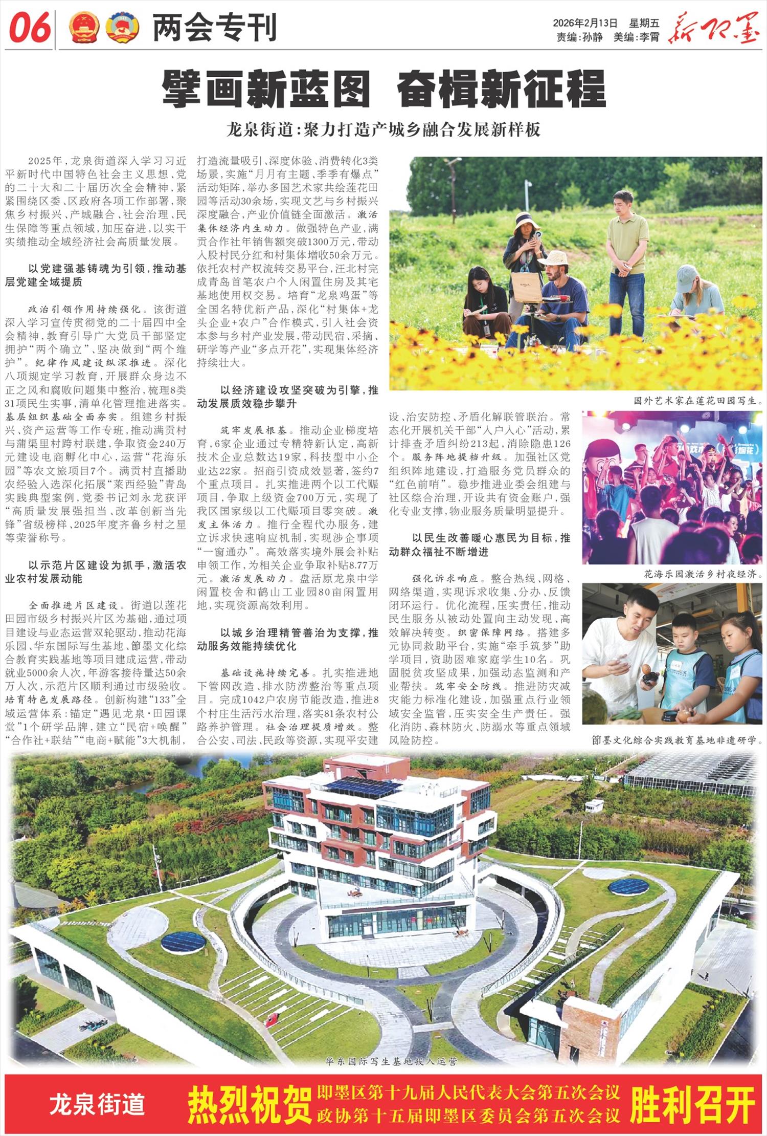 全面推进片区建设。街道以莲花田园市级乡村振兴片区为基础,通过项目建设与业态运营双轮驱动,推动花海乐园、华东国际写生基地、節墨文化综合教育实践基地等项目建成运营,带动就业5000余人次,年游客接待量达50余万人次,示范片区顺利通过市级验收。培育特色发展路径。创新构建“133”全域运营体系:锚定“遇见龙泉·田园课堂”1个研学品牌,建立“民宿+唤醒”“合作社+联结”“电商+赋能”3大机制,打造流量吸引、深度体验、消费转化3类场景,实施“月月有主题、季季有爆点”活动矩阵,举办多国艺术家共绘莲花田园等活动30余场,实现文艺与乡村振兴深度融合,产业价值链全面激活。激活集体经济内生动力。做强特色产业,满贡合作社年销售额突破1300万元,带动入股村民分红和村集体增收50余万元。依托农村产权流转交易平台,汪北村完成青岛首笔农户个人闲置住房及其宅基地使用权交易。培育“龙泉鸡蛋”等全国名特优新产品,深化“村集体+龙头企业+农户”合作模式,引入社会资本参与乡村产业发展,带动民宿、采摘、研学等产业“多点开花”,实现集体经济持续壮大。
