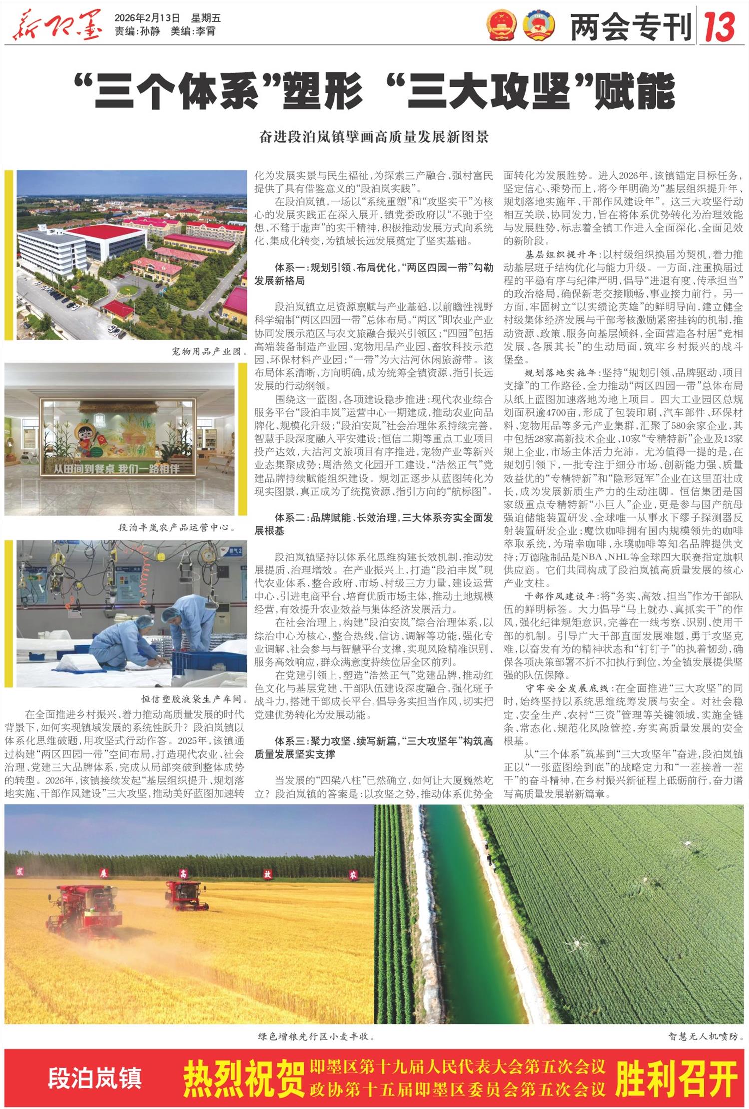 在全面推进乡村振兴、着力推动高质量发展的时代背景下,如何实现镇域发展的系统性跃升?段泊岚镇以体系化思维破题,用攻坚式行动作答。2025年,该镇通过构建“两区四园一带”空间布局,打造现代农业、社会治理、党建三大品牌体系,完成从局部突破到整体成势的转型。2026年,该镇接续发起“基层组织提升、规划落地实施、干部作风建设”三大攻坚,推动美好蓝图加速转化为发展实景与民生福祉,为探索三产融合、强村富民提供了具有借鉴意义的“段泊岚实践”。