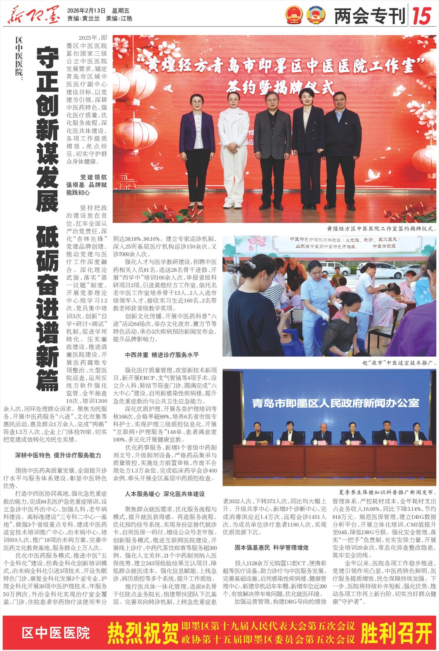 2025年,即墨区中医医院紧扣国家三级公立中医医院发展要求,锚定青岛市区域中医医疗副中心建设目标,以党建为引领,深耕中医药特色,强化医疗质量,优化服务流程,深化医共体建设,各项工作提质增效、亮点纷呈,切实守护群众身体健康。