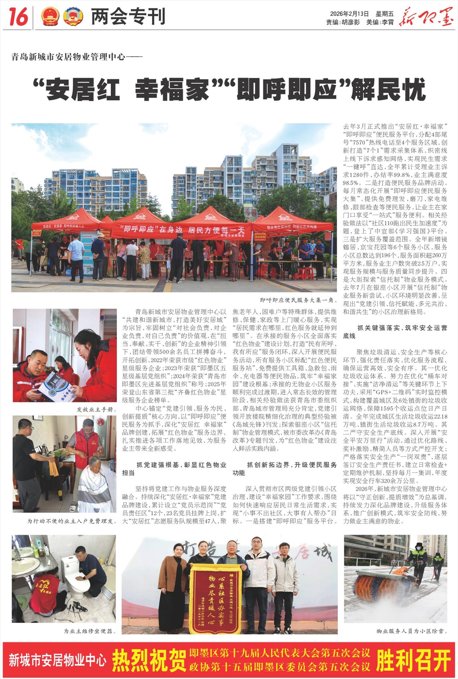 坚持将党建工作与物业服务深度融合。持续深化“安居红·幸福家”党建品牌建设,累计设立“党员示范岗”“党员责任区”12个,23名党员挂牌上岗,扩大“安居红”志愿服务队规模至47人,聚焦老年人、困难户等特殊群体,提供维修、保健、家政等上门暖心服务,实现“居民需求在哪里,红色服务就延伸到哪里”。在承接的服务小区全面落实“红色物业”建设计划,打造“民有所呼、我有所应”服务闭环,深入开展便民服务活动,所有服务小区标配“红色便民服务站”,免费提供工具箱、急救包、雨伞、充电器等便民物品,筑牢“幸福家园”建设根基;承接的无物业小区服务顺利完成过渡期,进入常态长效的管理阶段,相关经验做法获青岛市委组织部、青岛城市管理局充分肯定,党建引领开放楼院精细化治理的典型经验被《岛城先锋》刊发;探索银座小区“信托制”物业管理模式,被市委改革办《青岛改革》专题刊发,为“红色物业”建设注入鲜活实践内涵。