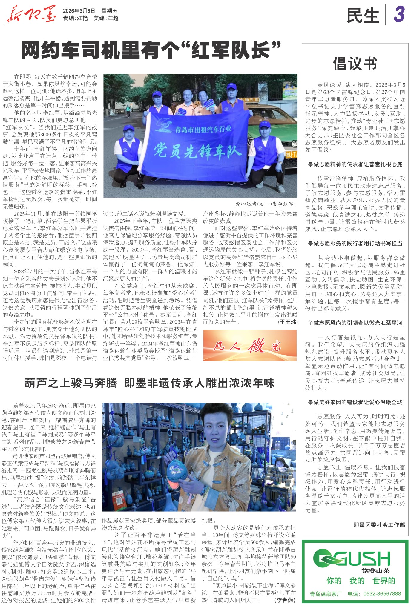 春风送暖,薪火相传。2026年3月5日是第63个学雷锋纪念日、第27个中国青年志愿者服务日。为深入贯彻习近平总书记关于学雷锋志愿服务的重要指示精神,大力弘扬奉献、友爱、互助、进步的志愿精神,推动“专业社工+志愿服务”深度融合,凝聚共建共治共享强大合力,即墨区委社会工作部向全区各志愿服务组织、广大志愿者朋友们发出如下倡议: