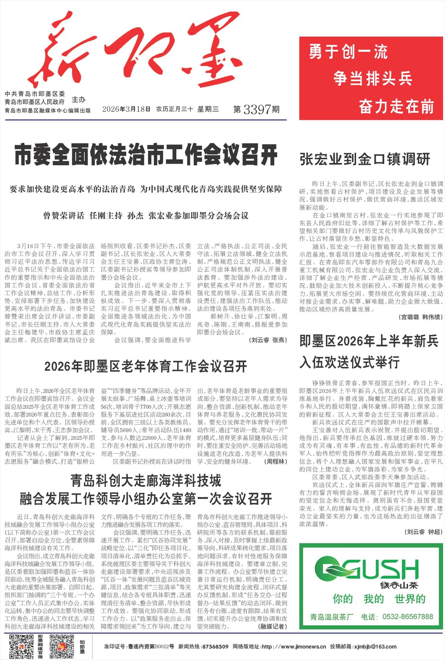 市委全面依法治市工作会议召开 要求加快建设更高水平的法治青岛 为中国式现代化青岛实践提供坚实保障曾赞荣讲话 任刚主持 孙杰 张宏业参加即墨分会场会议   3月16日下午,市委全面依法治市工作会议召开,深入学习贯彻习近平法治思想,传达学习习近平总书记关于全面依法治国工作的重要指示和中央全面依法治国工作会议、省委全面依法治省工作会议精神,总结工作、分析形势,安排部署下步任务,加快建设更高水平的法治青岛。市委书记曾赞荣出席会议并讲话,市委副书记、市长任刚主持,市人大常委会主任梅建华,市政协主席孟庆斌出席。我区在即墨宾馆设分会场组织收看,区委书记孙杰,区委副书记、区长张宏业,区人大常委会主任王宝善、区政协主席位涛、区委副书记孙授宾等领导参加即墨分会场会议。