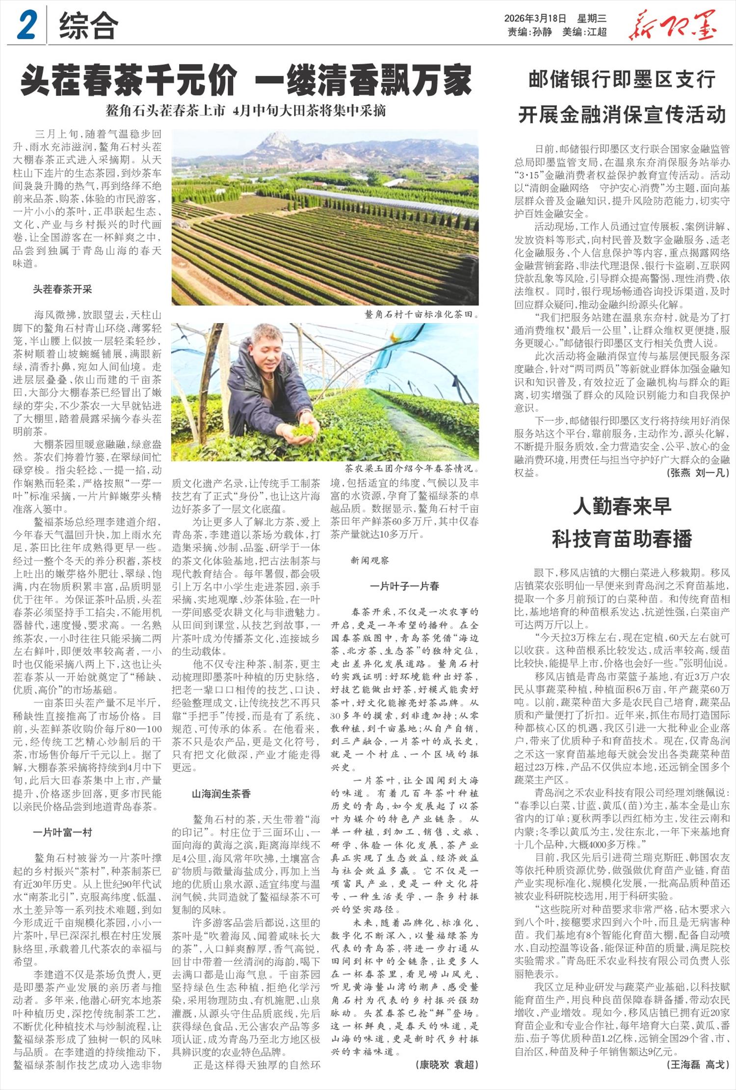 头茬春茶千元价 一缕清香飘万家 鳌角石头茬春茶上市 4月中旬大田茶将集中采摘   三月上旬,随着气温稳步回升、雨水充沛滋润,鳌角石村头茬大棚春茶正式进入采摘期。从天柱山下连片的生态茶园,到炒茶车间袅袅升腾的热气,再到络绎不绝前来品茶、购茶、体验的市民游客,一片小小的茶叶,正串联起生态、文化、产业与乡村振兴的时代画卷,让全国游客在一杯鲜爽之中,品尝到独属于青岛山海的春天味道。