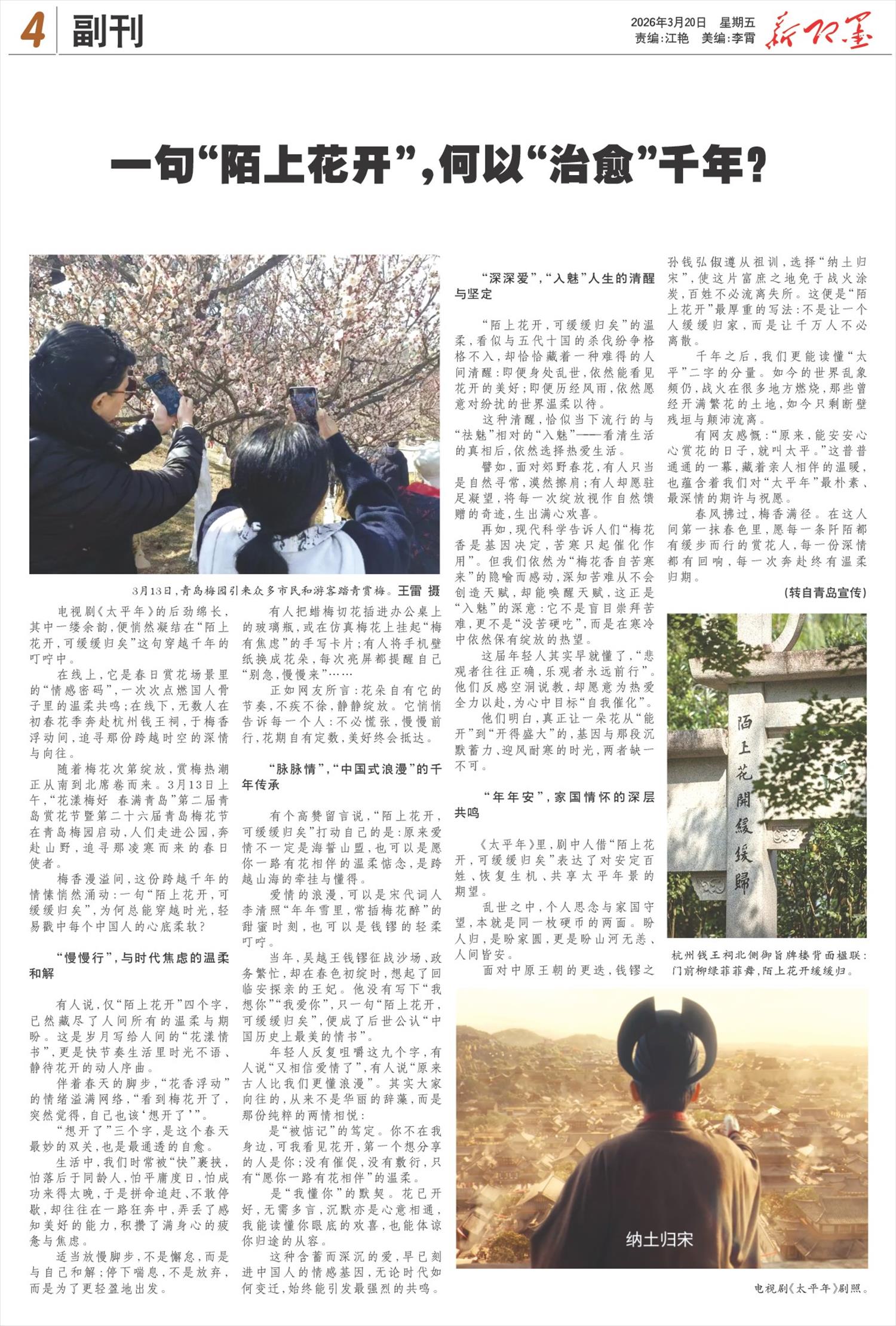 《太平年》里,剧中人借“陌上花开,可缓缓归矣”表达了对安定百姓、恢复生机、共享太平年景的期望。
