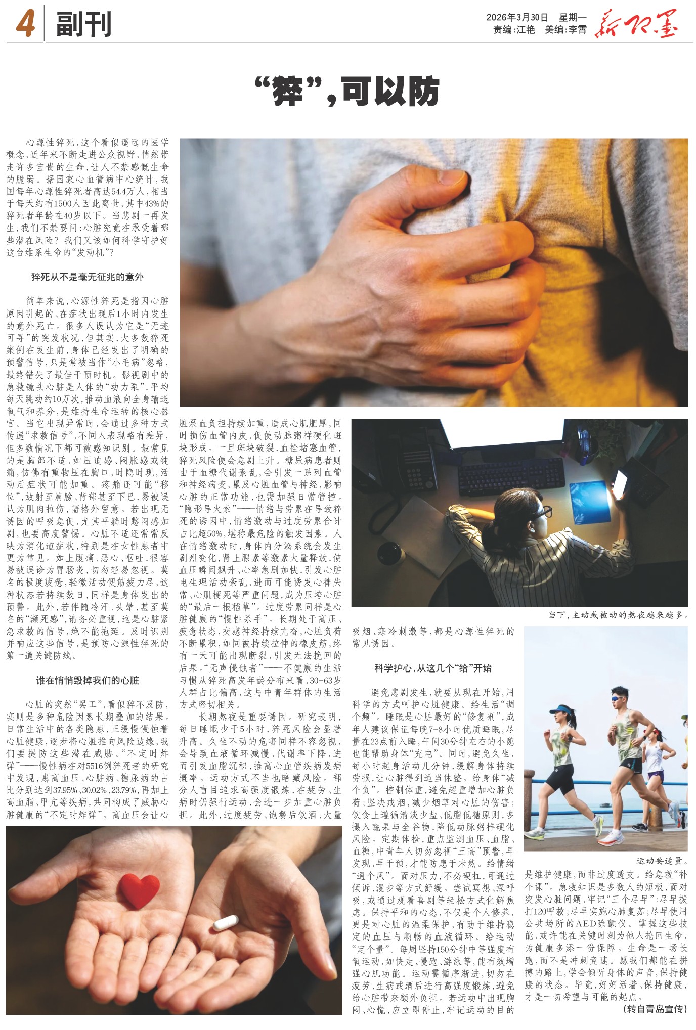 避免悲剧发生,就要从现在开始,用科学的方式呵护心脏健康。给生活“调个频”。睡眠是心脏最好的“修复剂”,成年人建议保证每晚7-8小时优质睡眠,尽量在23点前入睡,午间30分钟左右的小憩也能帮助身体“充电”。同时,避免久坐,每小时起身活动几分钟,缓解身体持续劳损,让心脏得到适当休整。给身体“减个负”。控制体重,避免超重增加心脏负荷;坚决戒烟,减少烟草对心脏的伤害;饮食上遵循清淡少盐、低脂低糖原则,多摄入蔬果与全谷物,降低动脉粥样硬化风险。定期体检,重点监测血压、血脂、血糖,中青年人切勿忽视“三高”预警,早发现、早干预,才能防患于未然。给情绪“通个风”。面对压力,不必硬扛,可通过倾诉、漫步等方式舒缓。尝试冥想、深呼吸,或通过观看喜剧等轻松方式化解焦虑。保持平和的心态,不仅是个人修养,更是对心脏的温柔保护,有助于维持稳定的血压与顺畅的血液循环。给运动“定个量”。每周坚持150分钟中等强度有氧运动,如快走、慢跑、游泳等,能有效增强心肌功能。运动需循序渐进,切勿在疲劳、生病或酒后进行高强度锻炼,避免给心脏带来额外负担。若运动中出现胸闷、心慌,应立即停止,牢记运动的目的是维护健康,而非过度透支。给急救“补个课”。急救知识是多数人的短板,面对突发心脏问题,牢记“三个尽早”:尽早拨打120呼救;尽早实施心肺复苏;尽早使用公共场所的AED除颤仪。掌握这些技能,或许能在关键时刻为他人抢回生命,为健康多添一份保障。生命是一场长跑,而不是冲刺竞速。愿我们都能在拼搏的路上,学会倾听身体的声音,保持健康的状态。毕竟,好好活着、保持健康,才是一切希望与可能的起点。