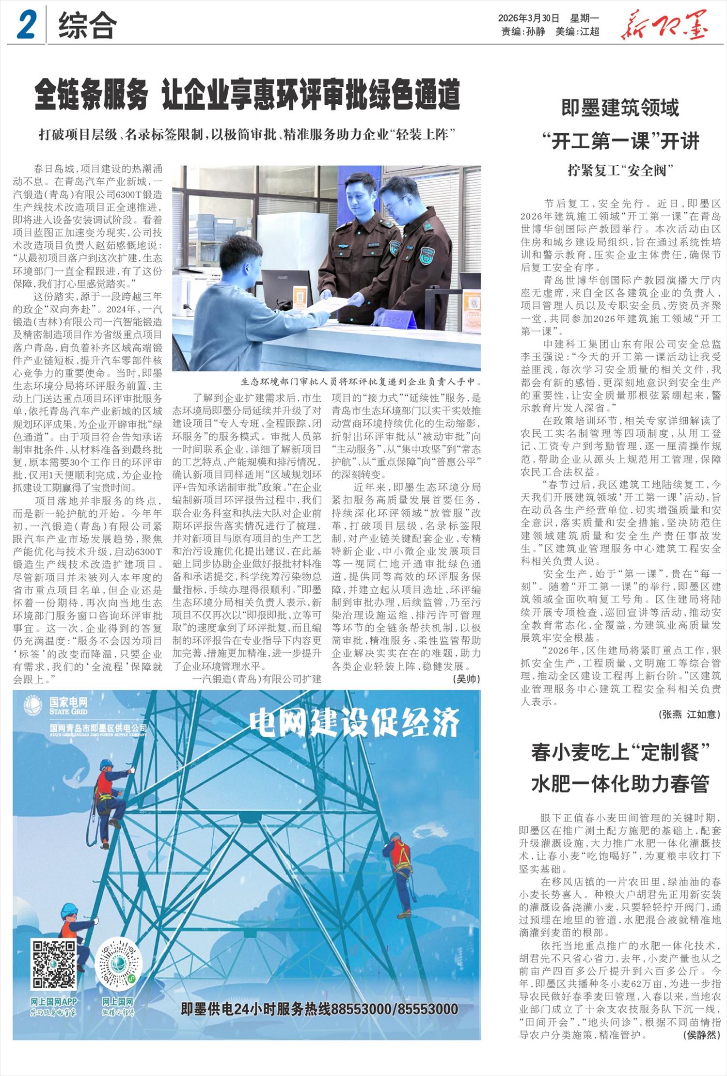 近年来,即墨生态环境分局紧扣服务高质量发展首要任务,持续深化环评领域“放管服”改革,打破项目层级、名录标签限制,对产业链关键配套企业、专精特新企业、中小微企业发展项目等一视同仁地开通审批绿色通道,提供同等高效的环评服务保障,并建立起从项目选址、环评编制到审批办理、后续监管,乃至污染治理设施运维、排污许可管理等环节的全链条帮扶机制,以极简审批、精准服务、柔性监管帮助企业解决实实在在的难题,助力各类企业轻装上阵、稳健发展。 (吴帅)