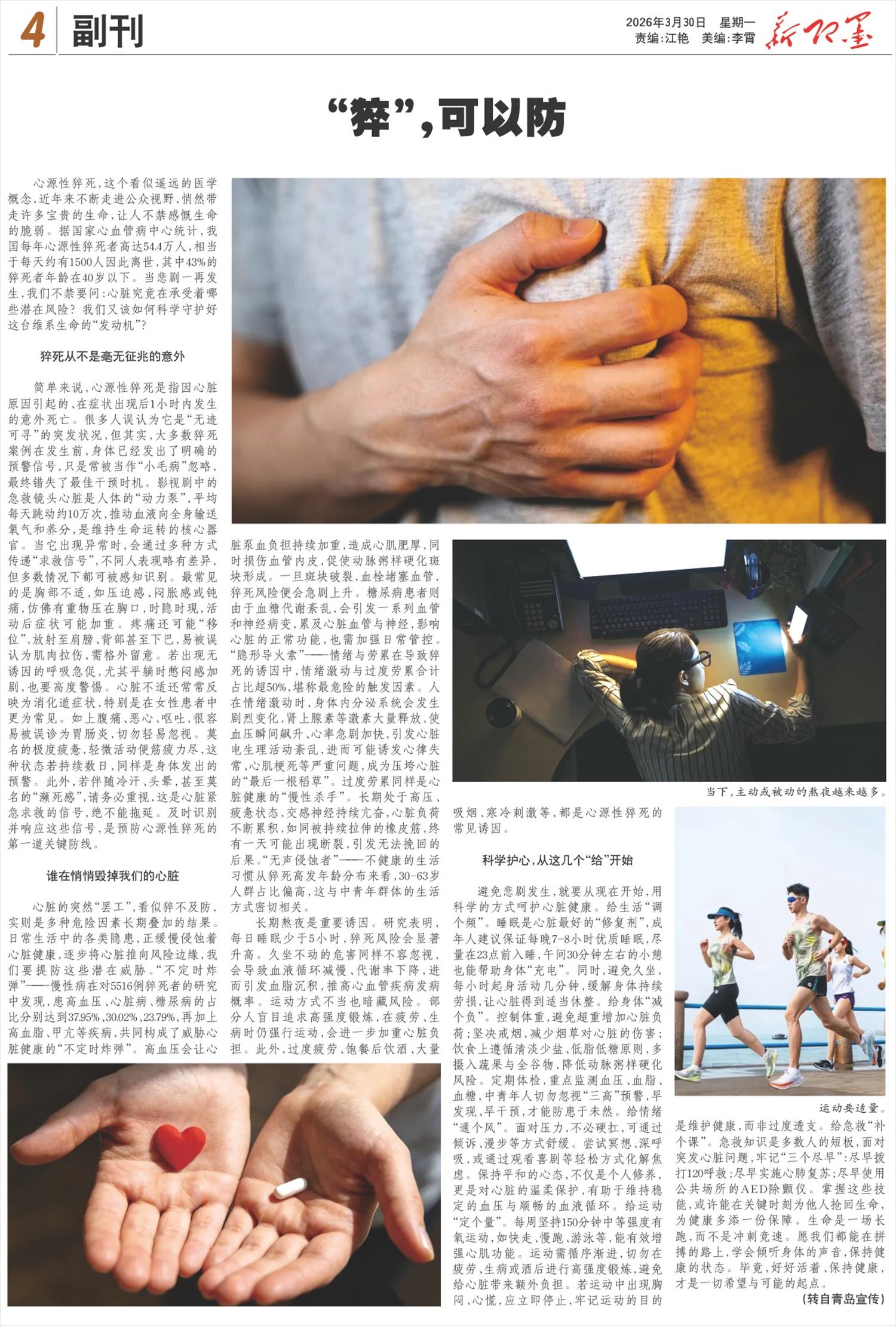 避免悲剧发生,就要从现在开始,用科学的方式呵护心脏健康。给生活“调个频”。睡眠是心脏最好的“修复剂”,成年人建议保证每晚7-8小时优质睡眠,尽量在23点前入睡,午间30分钟左右的小憩也能帮助身体“充电”。同时,避免久坐,每小时起身活动几分钟,缓解身体持续劳损,让心脏得到适当休整。给身体“减个负”。控制体重,避免超重增加心脏负荷;坚决戒烟,减少烟草对心脏的伤害;饮食上遵循清淡少盐、低脂低糖原则,多摄入蔬果与全谷物,降低动脉粥样硬化风险。定期体检,重点监测血压、血脂、血糖,中青年人切勿忽视“三高”预警,早发现、早干预,才能防患于未然。给情绪“通个风”。面对压力,不必硬扛,可通过倾诉、漫步等方式舒缓。尝试冥想、深呼吸,或通过观看喜剧等轻松方式化解焦虑。保持平和的心态,不仅是个人修养,更是对心脏的温柔保护,有助于维持稳定的血压与顺畅的血液循环。给运动“定个量”。每周坚持150分钟中等强度有氧运动,如快走、慢跑、游泳等,能有效增强心肌功能。运动需循序渐进,切勿在疲劳、生病或酒后进行高强度锻炼,避免给心脏带来额外负担。若运动中出现胸闷、心慌,应立即停止,牢记运动的目的是维护健康,而非过度透支。给急救“补个课”。急救知识是多数人的短板,面对突发心脏问题,牢记“三个尽早”:尽早拨打120呼救;尽早实施心肺复苏;尽早使用公共场所的AED除颤仪。掌握这些技能,或许能在关键时刻为他人抢回生命,为健康多添一份保障。生命是一场长跑,而不是冲刺竞速。愿我们都能在拼搏的路上,学会倾听身体的声音,保持健康的状态。毕竟,好好活着、保持健康,才是一切希望与可能的起点。