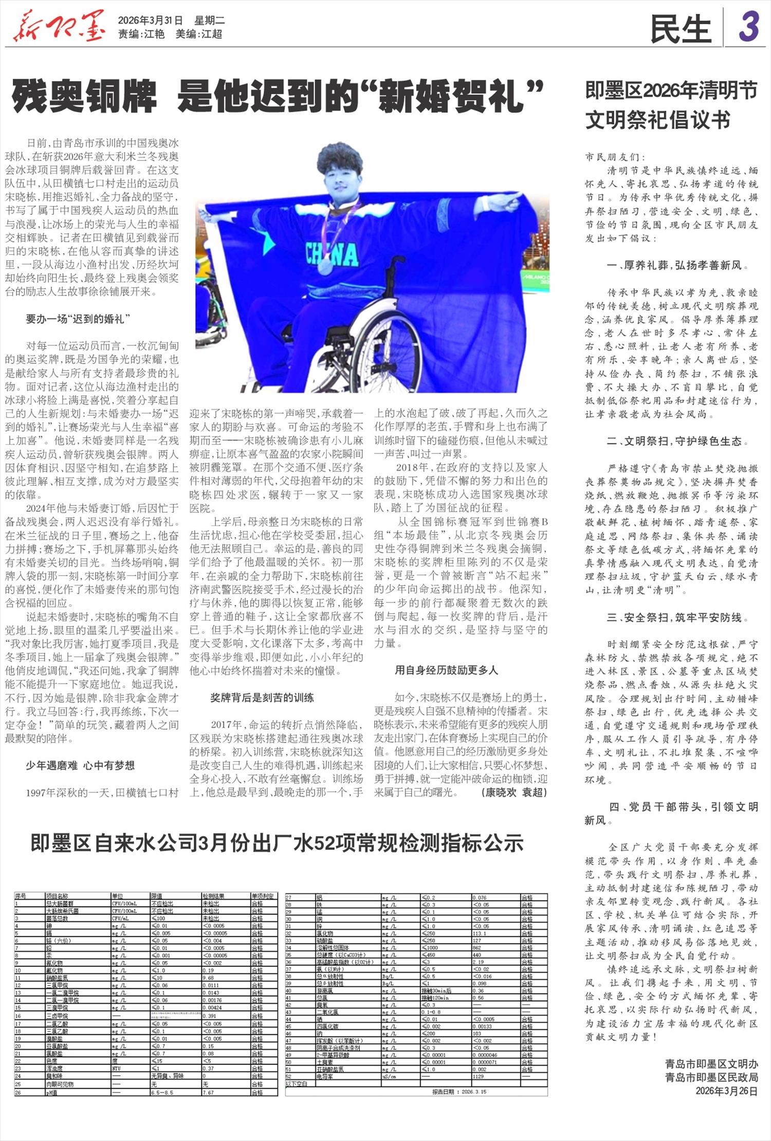 日前,由青岛市承训的中国残奥冰球队,在斩获2026年意大利米兰冬残奥会冰球项目铜牌后载誉回青。在这支队伍中,从田横镇七口村走出的运动员宋晓栋,用推迟婚礼、全力备战的坚守,书写了属于中国残疾人运动员的热血与浪漫,让冰场上的荣光与人生的幸福交相辉映。记者在田横镇见到载誉而归的宋晓栋,在他从容而真挚的讲述里,一段从海边小渔村出发、历经坎坷却始终向阳生长、最终登上残奥会领奖台的励志人生故事徐徐铺展开来。