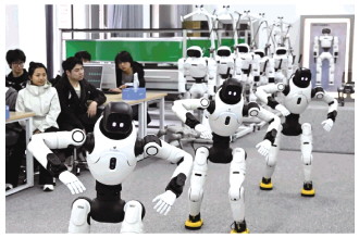 在青岛职业技术学院具身智能机器人实训基地,人形机器人演示动作编程效果。