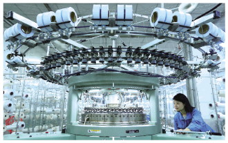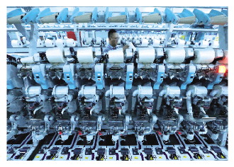下图为即发集团的纺织工人在10万纱锭智慧纺纱生产线上生产高端纤维产品。 (刘兰星)