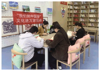 墙面错落挂着居民的作品:福字纹样的剪纸洇着红意,淡彩山水书画晕开浅绿,木质书架上的书籍码得齐整,印着卡通形象的软枕垫在椅背上,天蓝色地面裹住了鞋底的凉意。顶灯的暖光在长桌铺出软绵的光斑,杯壁凝着细水珠的暖茶、裹着桂花香气,早把冬寒浸成了软和的甜。