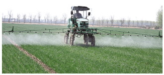 农民驾驶自走式高杆喷雾机对小麦进行喷药作业。
