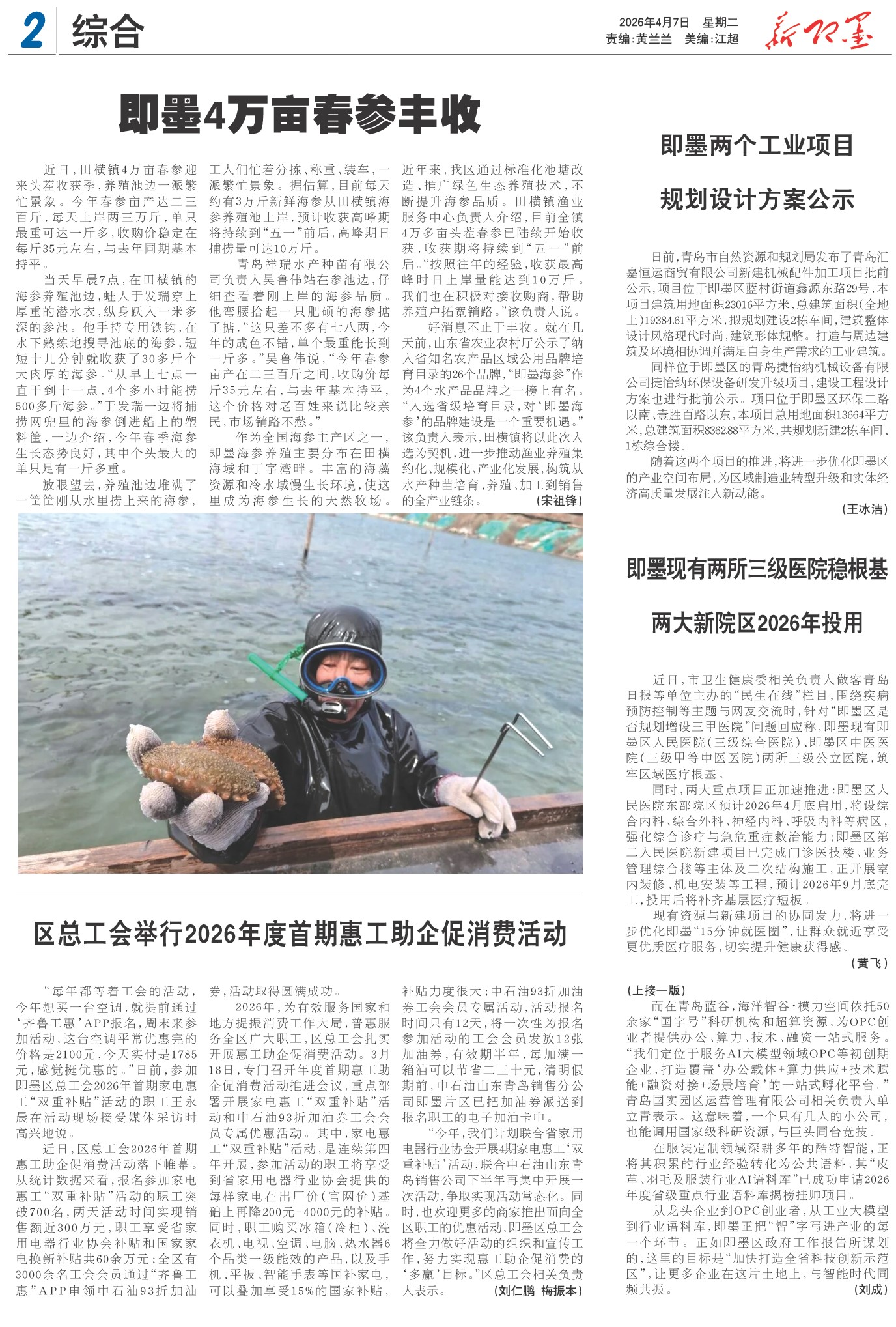 同时,两大重点项目正加速推进:即墨区人民医院东部院区预计2026年4月底启用,将设综合内科、综合外科、神经内科、呼吸内科等病区,强化综合诊疗与急危重症救治能力;即墨区第二人民医院新建项目已完成门诊医技楼、业务管理综合楼等主体及二次结构施工,正开展室内装修、机电安装等工程,预计2026年9月底完工,投用后将补齐基层医疗短板。